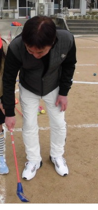2~3日前の厳寒から少し気温が上がり児童たちは元気にグランドに集合し、体験授業はスナッグ道具の説明、そしてクラブの握り方、構え方などから始まり島田プロのデモショットには歓声が上がり大拍手